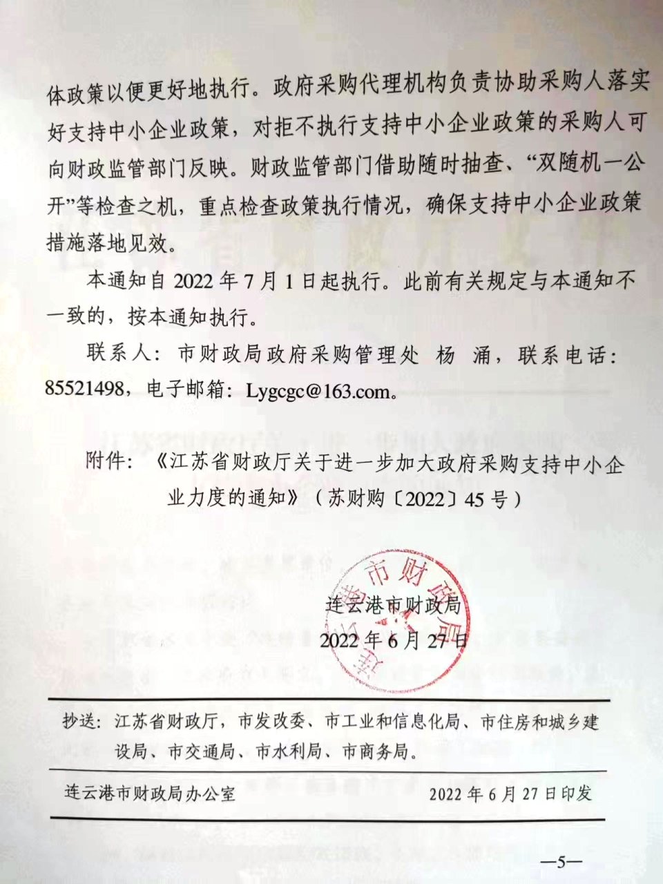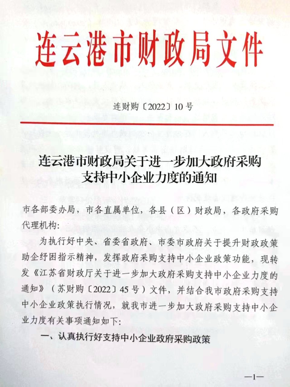 连云港市财政局关于进一步加大政府采购支持中小企业力度的通知(连财购〔2022〕10号)