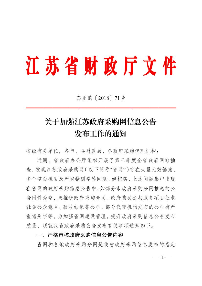 关于加强江苏政府采购网信息公告发布工作的通知(苏财购〔2018〕71号)