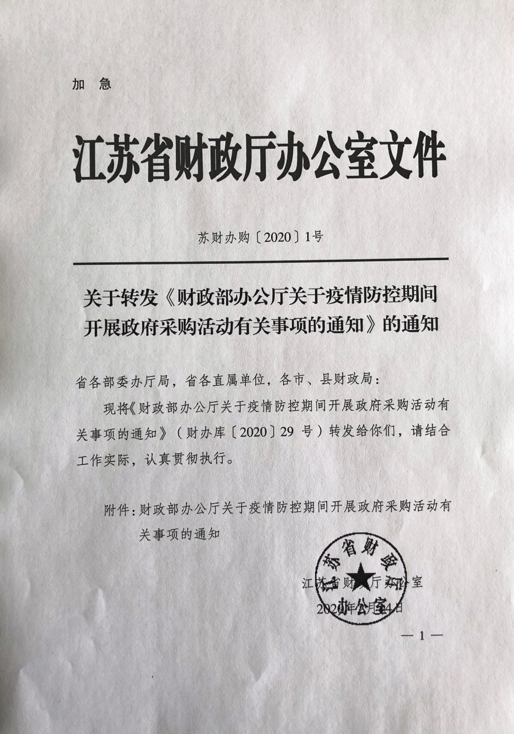 关于转发《财政部办公厅关于疫情防控期间开展政府采购活动有关事项的通知》的通知(苏财办购〔2020〕1号)