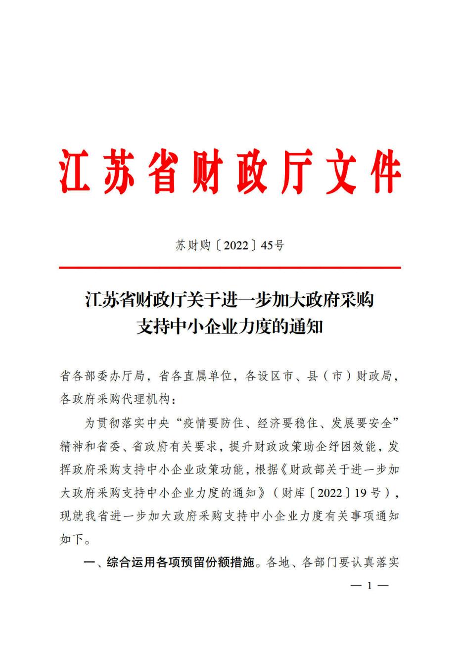 江苏省财政厅关于进一步加大政府采购支持中小企业力度的通知(苏财购〔2022〕45号)