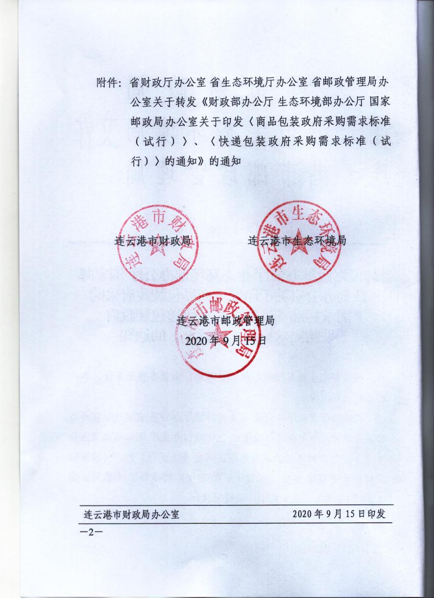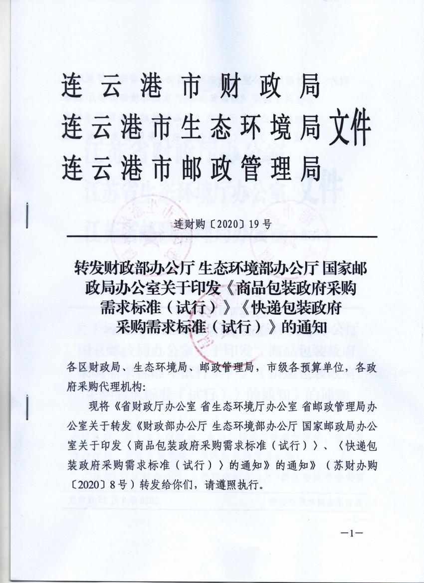 转发财政部办公厅 生态环境部办公厅 国家邮政局办公室关于印发《商品包装政府采购需求标准(试行)》《快递包装政府采购需求标准(试行 )》的通知(连财购〔2020〕19号 )