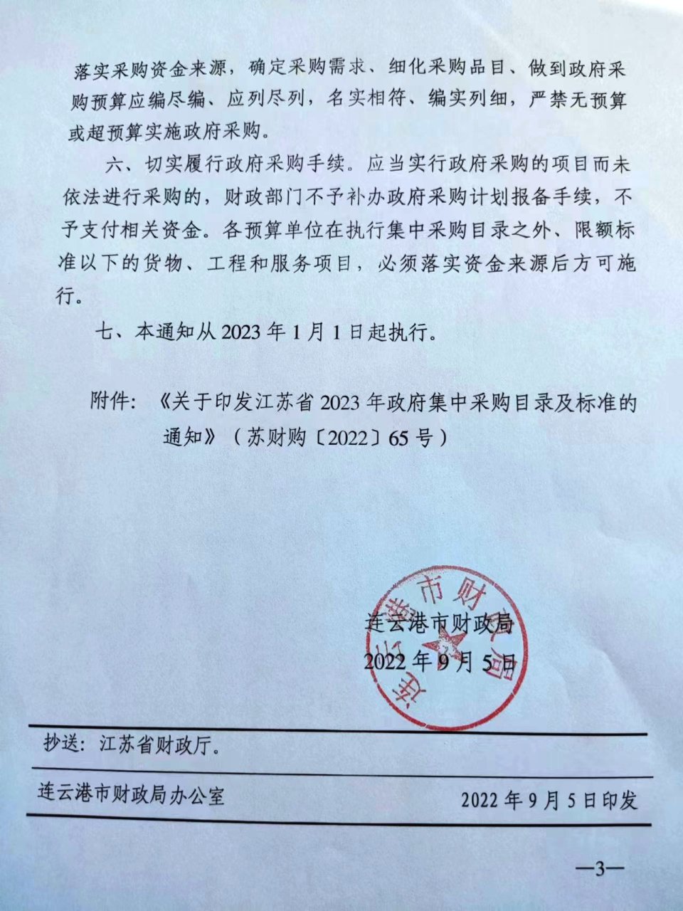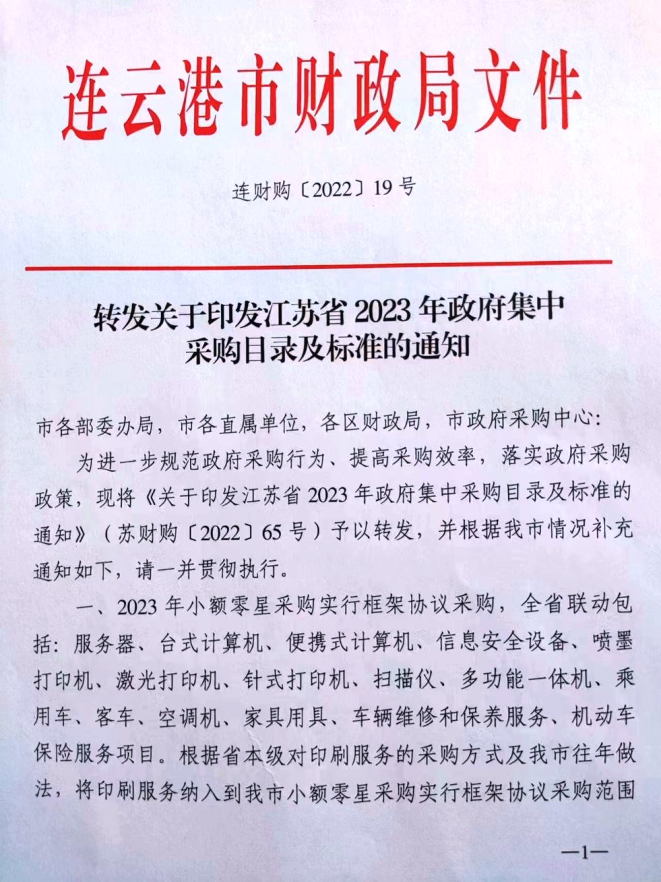 转发关于印发江苏省2023年政府集中采购目录及标准的通知(连财购〔2022〕19号)