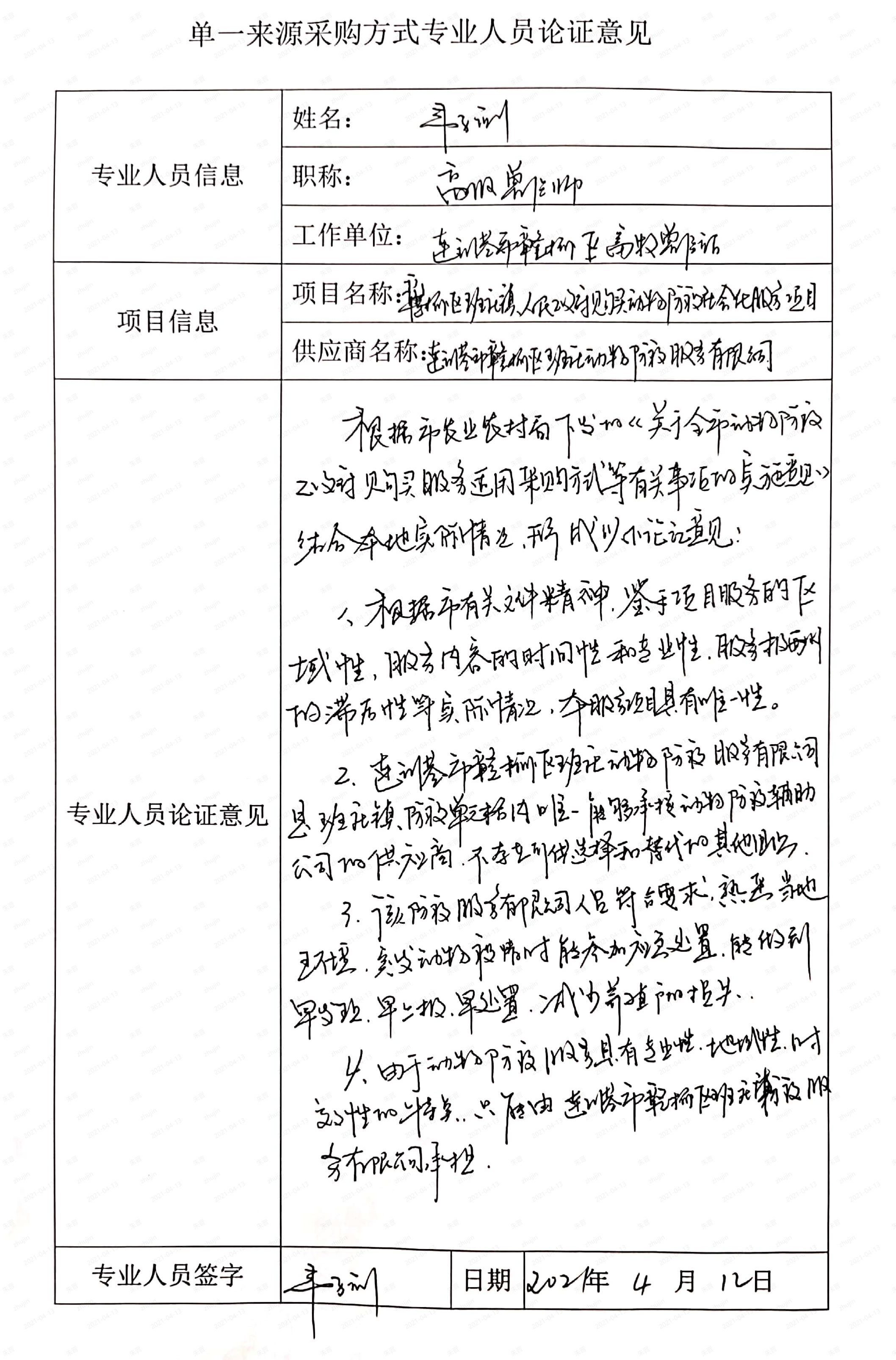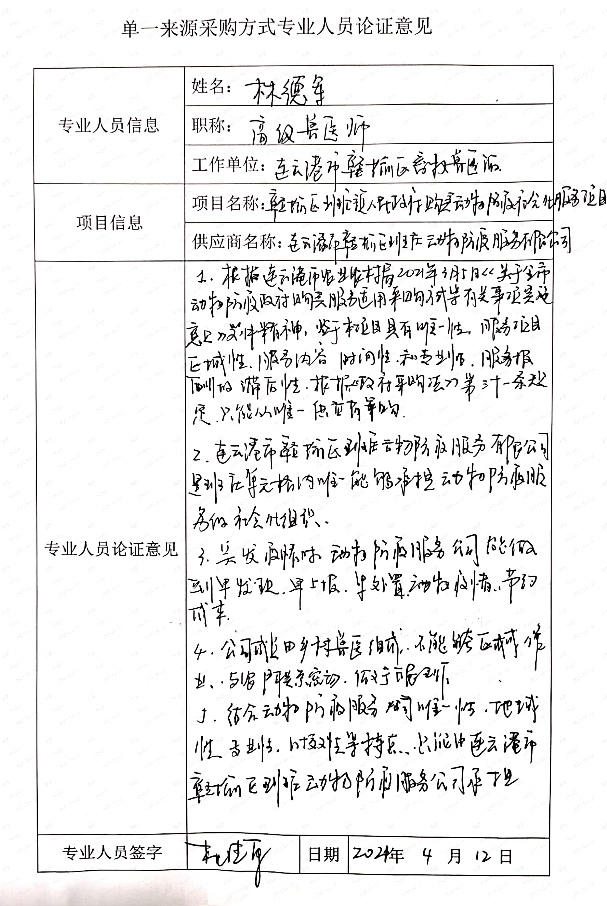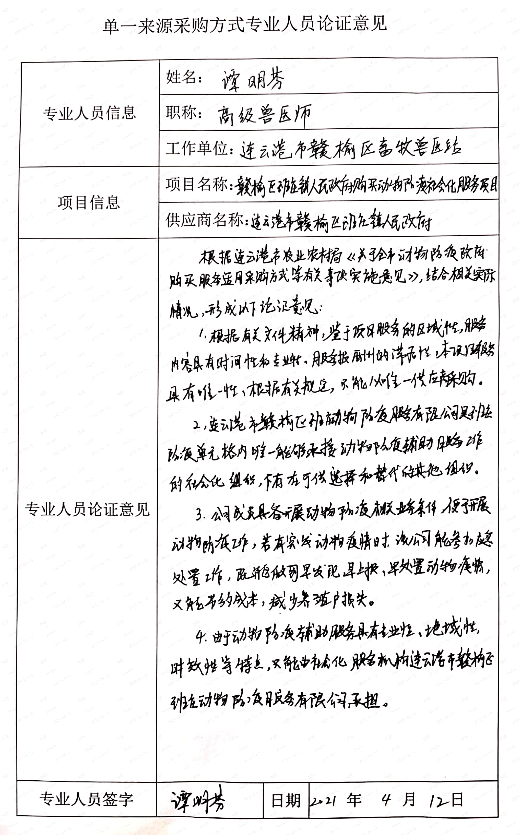 专业人员论证意见:1、根据连政发(2020)14号《市政府办公室关于推进全市动物防疫社会化服务发展的通知》,连云港市农业农村局2021年3月5日《关于全市动物防疫政府购买服务适用采购方式等有关事项实施意见》等文件精神,鉴于本服务项目具有唯一性,项目服务的区域性,服务内容的时间性和专业性,服务报酬的滞后性,根据《政府采购法》第三十一条规定,只能从唯一供应商采购,符合采用单一来源采购方式。2、连云港市赣榆区班庄动物防疫服务有限公司是班庄防疫单元格内唯一能够承接动物防疫辅助服务工作的社会化组织,不存在可供选择和替代的其他组织。3、公司成员由当地执业兽医、乡村兽医为主体,熟悉当地环境,与养殖农户联系密切,掌握分布信息,便于开展动物防疫工作。4、突发动物疫情时,该公司能参加应急处置工作,既能做到早发现,早上报、早处置动物疫情,又能节约成本,减少养殖农户损失。5、由于动物防疫辅助服务具有专业性、地域性和时效性等特点,只能由社会化服务机构连云港市赣榆区班庄动物防疫服务有限公司承担。