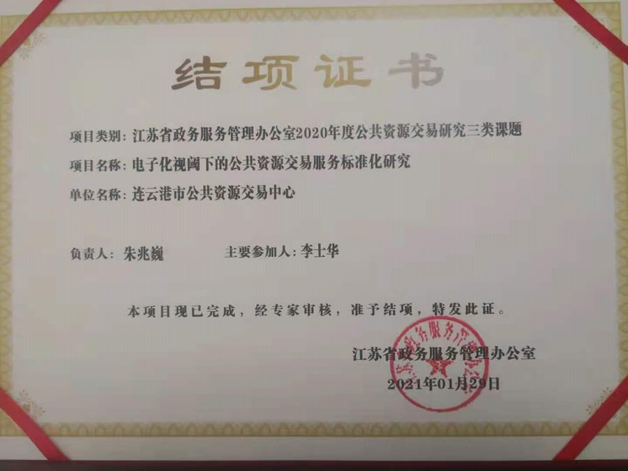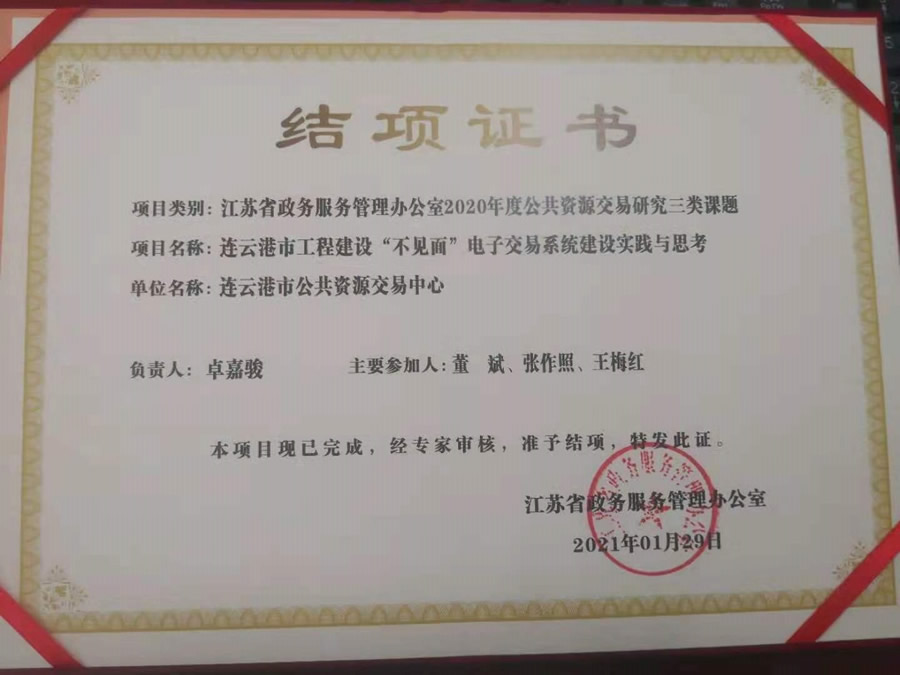 日前,省政务办通报2020年度体育365真正官网下载_365bet体育在线投注官网_beat365官方网站正规交易研究成果,市体育365真正官网下载_365bet体育在线投注官网_beat365官方网站正规交易中心刘康《政府采购全流程电子化关键问题研究》、朱兆巍《电子化视阈下的体育365真正官网下载_365bet体育在线投注官网_beat365官方网站正规交易服务标准化研究》、卓嘉骏《连云港市工程建设“不见面”电子交易系统建设实践与思考》三项课题顺利通过专家审核,准予结项,并颁发了结项证书。