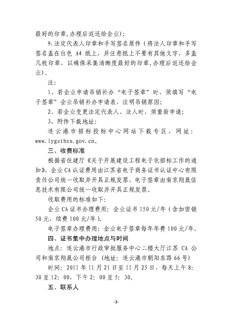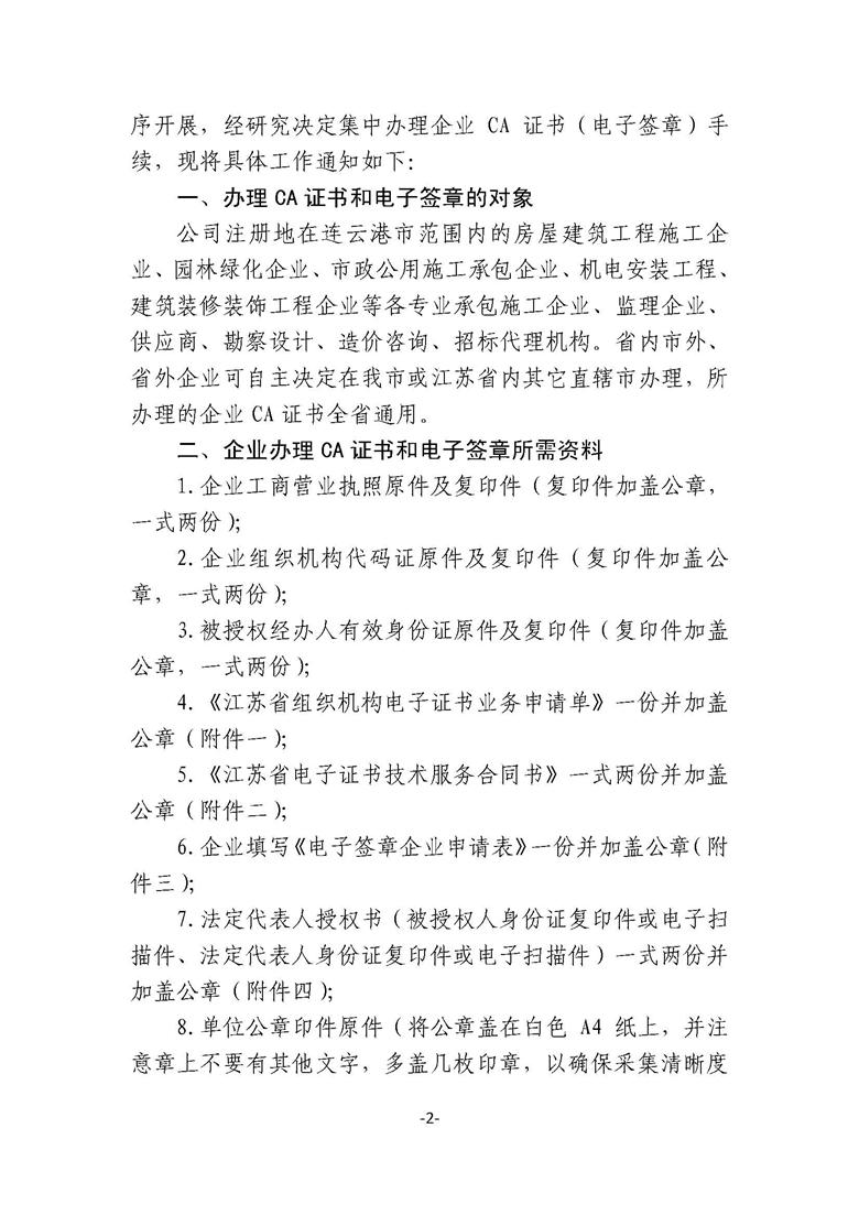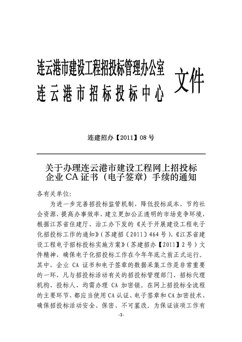 关于办理连云港市建设工程网上招投标企业CA证书(电子签章)手续的通知连建招办【2011】08号