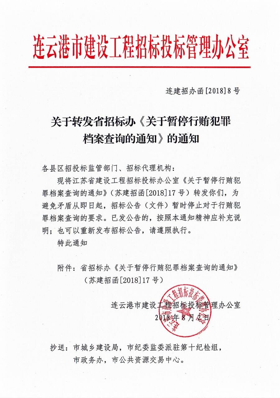 关于转发省招标办《关于暂停行贿犯罪档案查询的通知》的通知 连建招办函【2018】8号