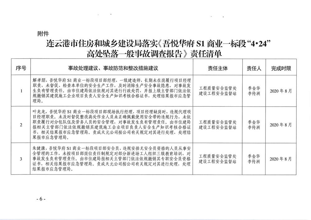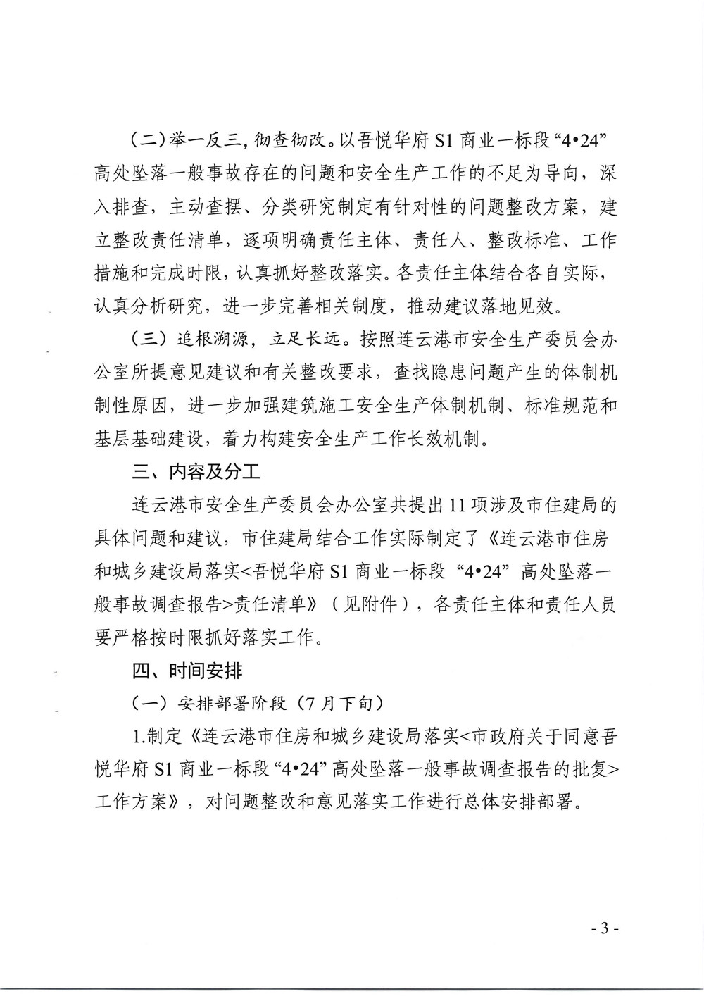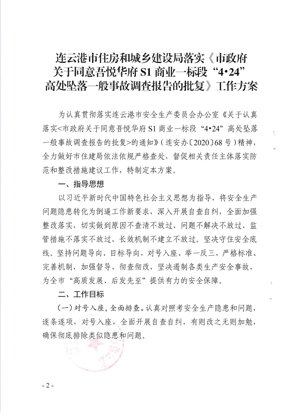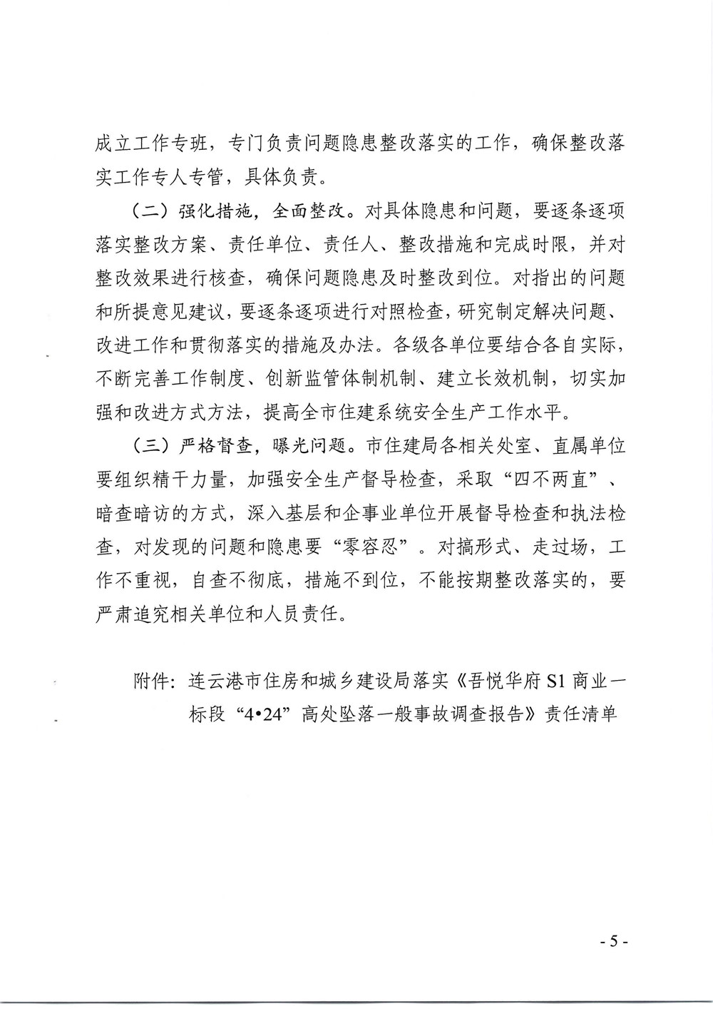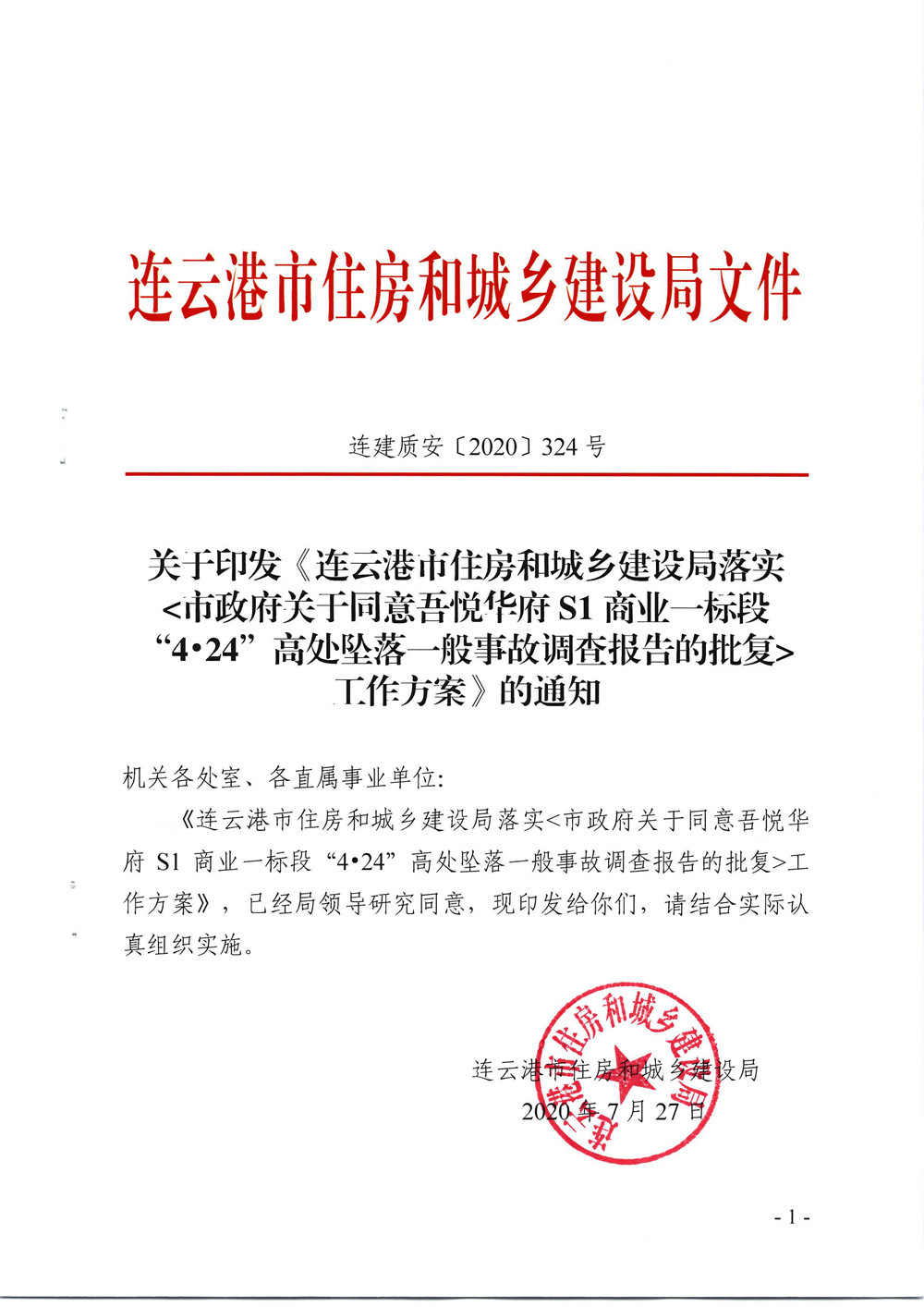 关于印发《连云港市住房和城乡建设局落实<市政府关于同意吾悦华府s1商业一标段"4.24"高处坠落一般事故调查报告的批复>工作方案》的通知市政府关于同意吾悦华府s1商业一标段"4.24"高处坠落一般事故调查报告的批复>