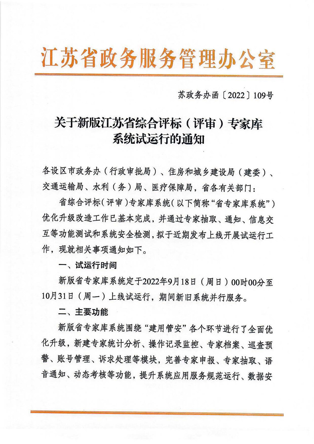 关于新版江苏省综合评标(评审)专家库系统试运行的通知
