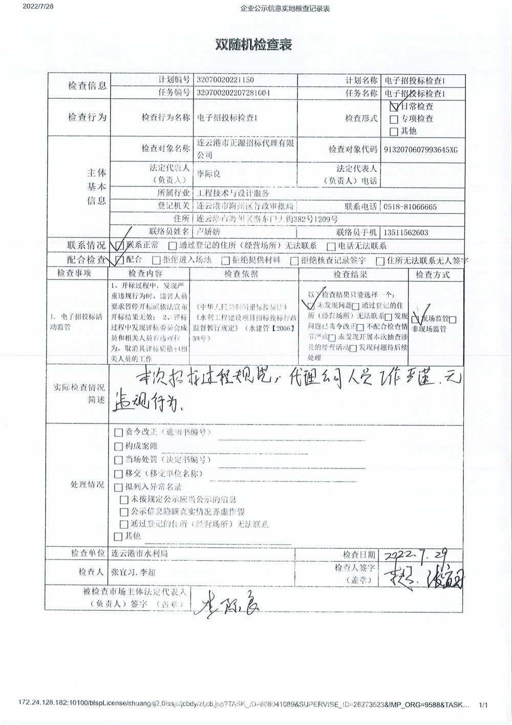 | 根据《市水利局关于开展2022年水利工程招标投标“双随机、一公开”检查工作的通知》要求,市水利局对江苏省鸿源招标代理股份有限公司、江苏鸿成工程项目管理有限公司、连云港市正源招标代理有限公司、江苏交通工程投资咨询有限公司、中企华建友工程管理有限公司共5个招标代理机构进行电子招投标检查。现将随机监督抽查结果公示如下: | |||