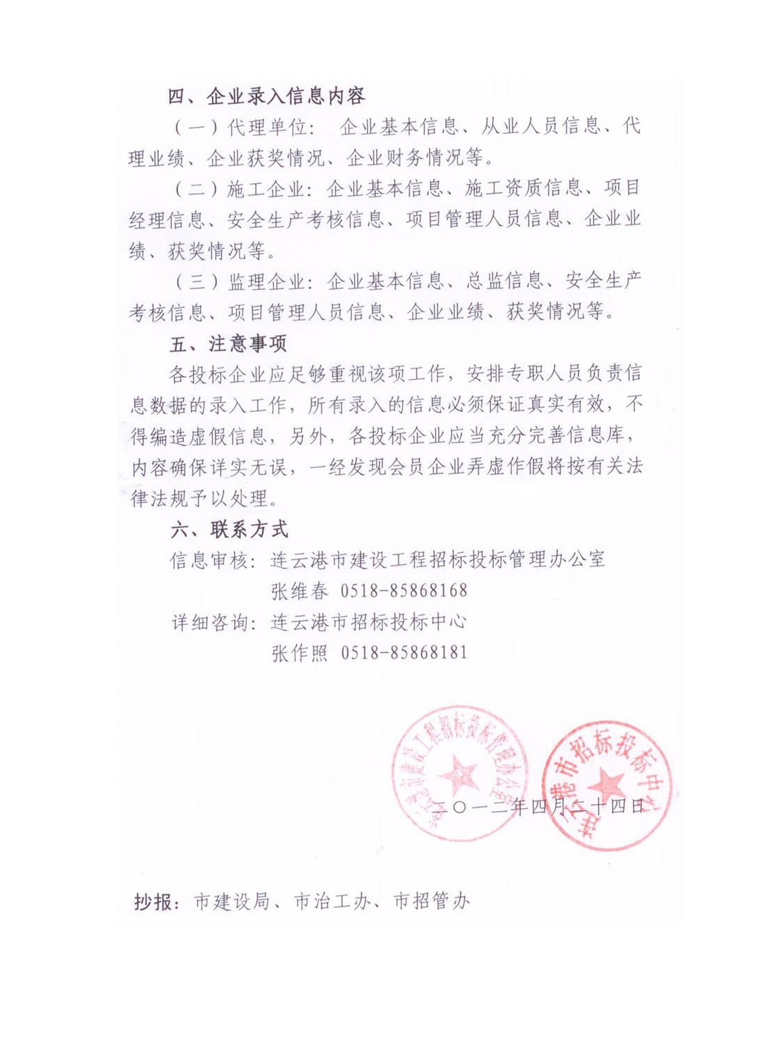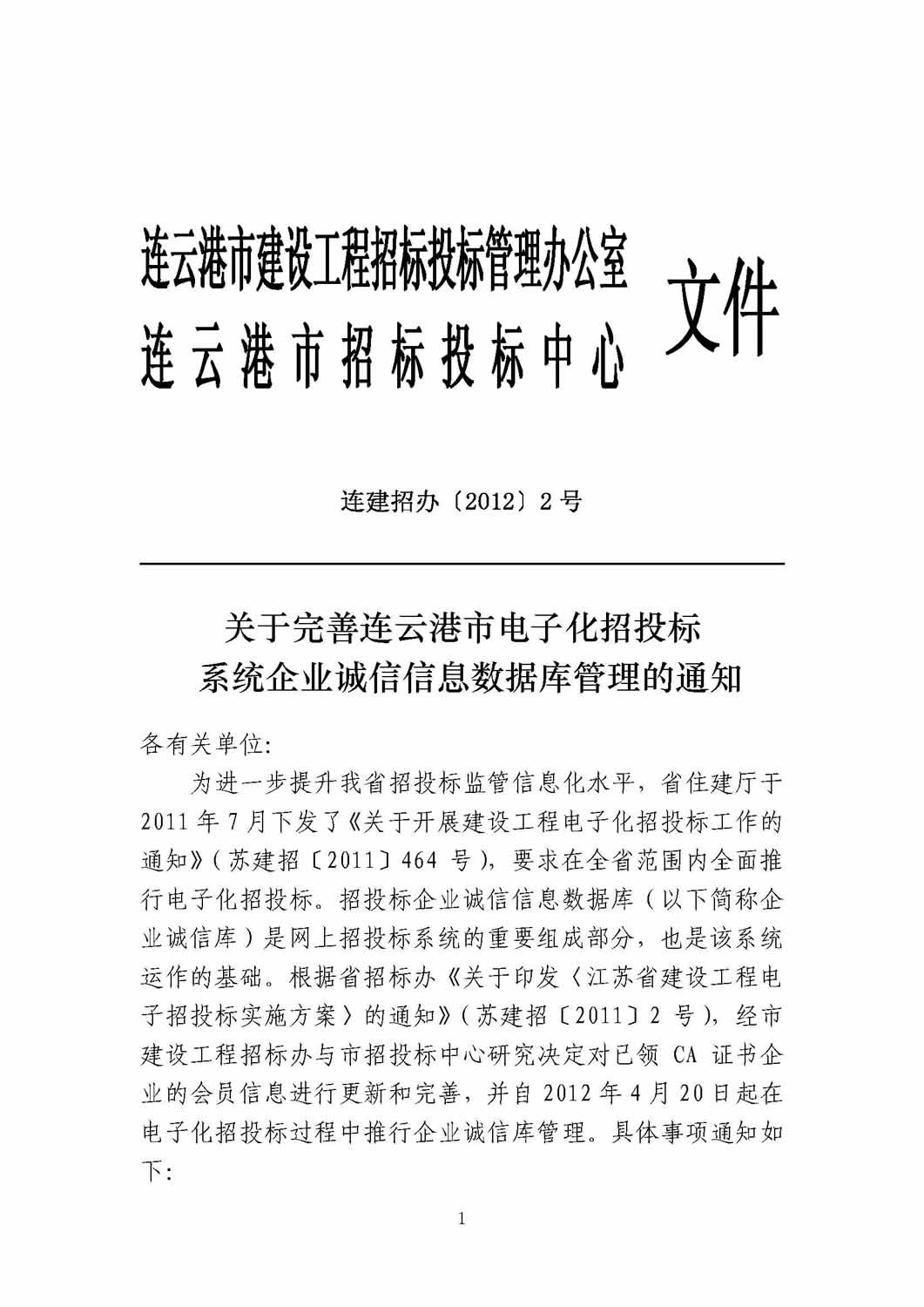 关于完善连云港市电子化招投标系统企业诚信信息数据库管理的通知 连建招办〔2012〕2号