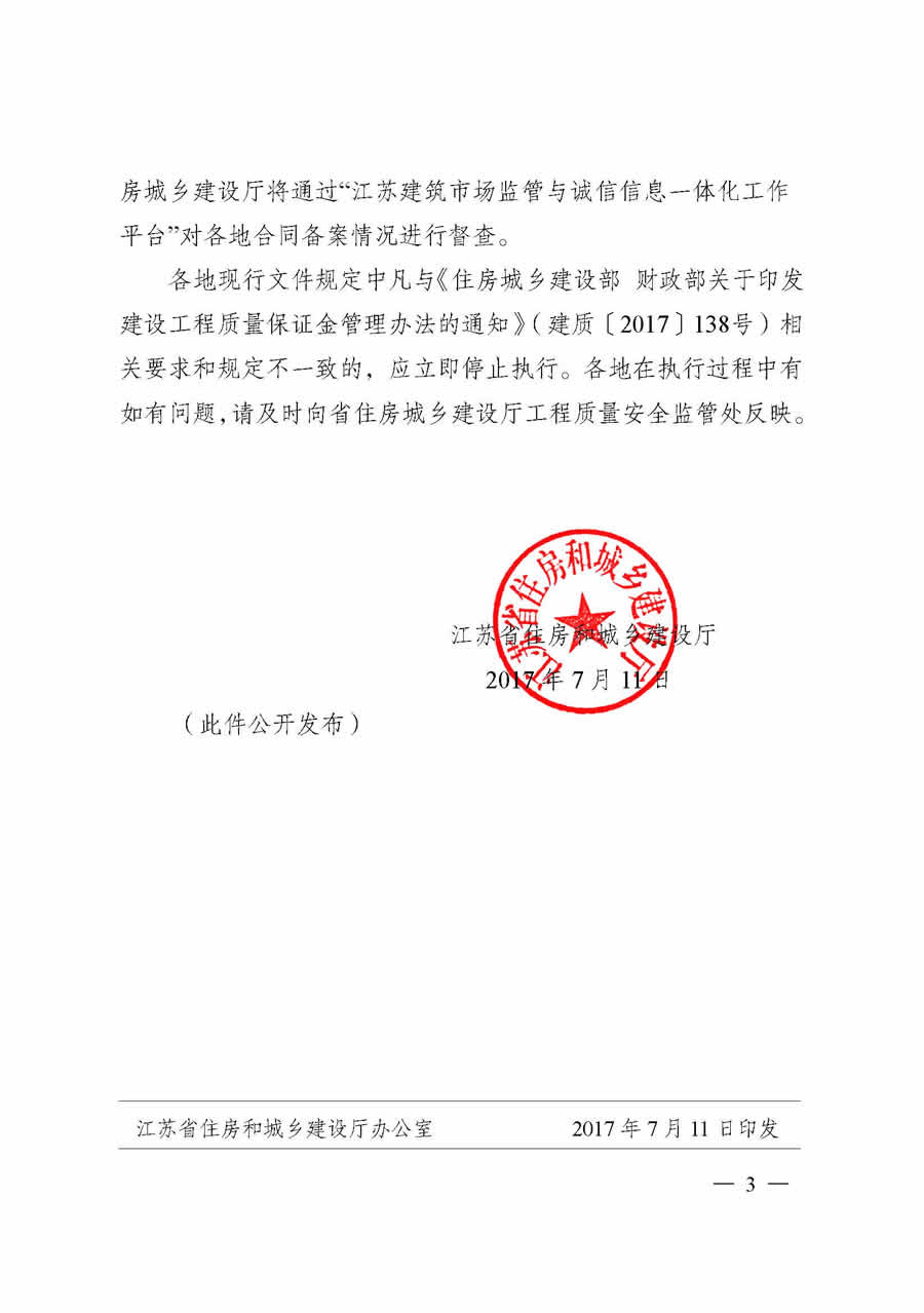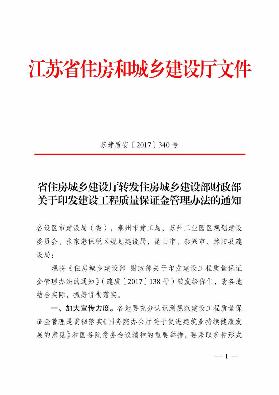 江苏省住房城乡建设厅转发住房城乡建设部财政部关于印发建设工程质量保证金管理办法的通知