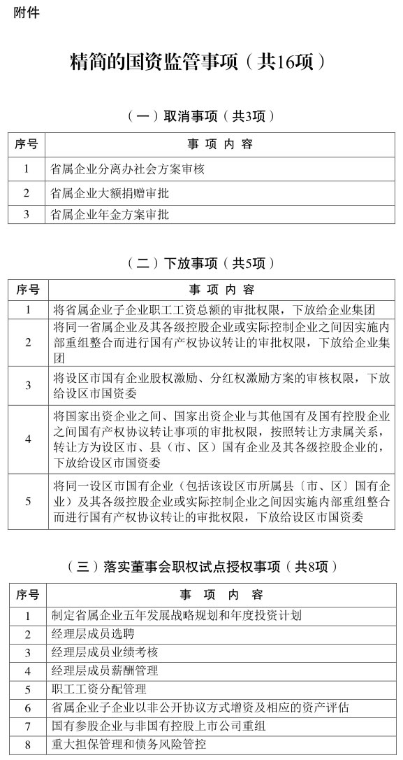 3﹒授权一批监管事项。结合落实董事会职权试点工作,将出资人的部分权利授权试点企业董事会行使,同时健全完善制度规范,切实加强备案管理和事后监督。具体授权监管事项8项:(1)制定省属企业五年发展战略规划和年度投资计划;(2)经理层成员选聘;(3)经理层成员业绩考核;(4)经理层成员薪酬管理;(5)职工工资分配管理;(6)省属企业子企业以非公开协议方式增资及相应的资产评估;(7)国有参股企业与非国有控股上市公司重组;(8)重大担保管理和债务风险管控。试点企业董事会要进一步健全和规范决策制度,明确授权事项在企业内部的决策、执行、监督机制,落实相应责任,严格责任追究。