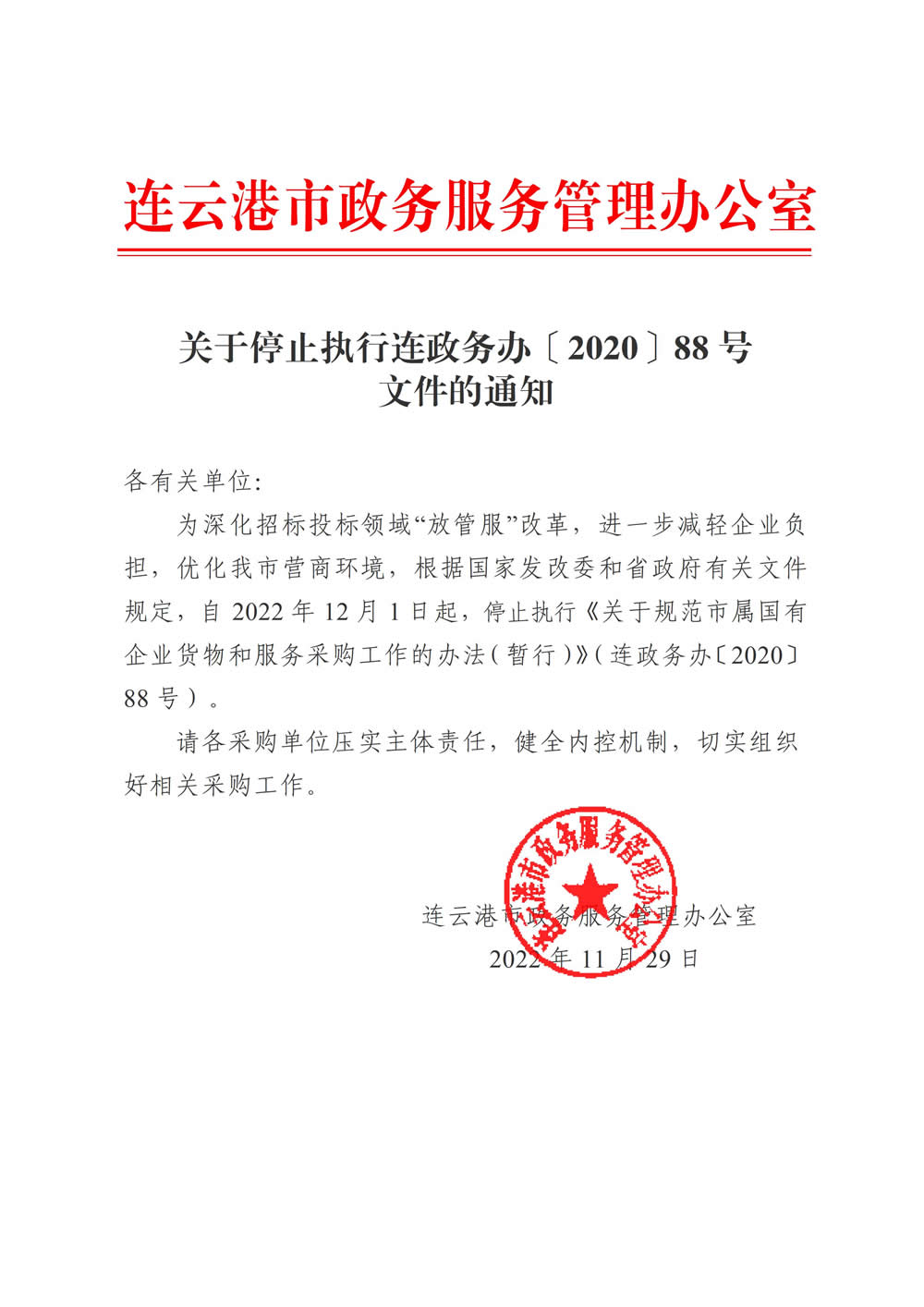 关于停止执行连政务办〔2020〕88号文件的通知